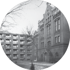 1973 Neubau auf dem Grundstück Wrangelstraße 33 auf dem Standort des 1945 zerstörten Nordflügels.
